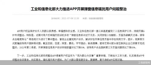 对这些用户反映强烈、投诉较多的“弹窗信息标识近于无形、关闭按钮小如蝼蚁、页面伪装瞒天过海、诱导点击暗度陈仓”等违规行为,工信部在近期进行了集中整治,并督促企业重视用户诉求,解决好在开屏信息页面中存在利用文字、图片、视屏等方式欺骗误导用户跳转等问题。