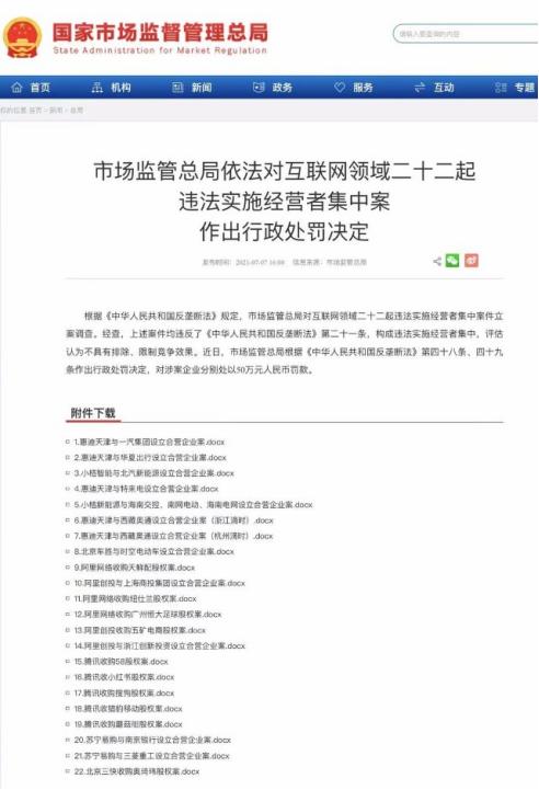 7月7日,市场监管总局针对互联网领域22起反垄断案件作出处罚,处以50万元人民币罚款。涉及腾讯、阿里、58、小红书、搜狗、小桔新能源等多家公司。