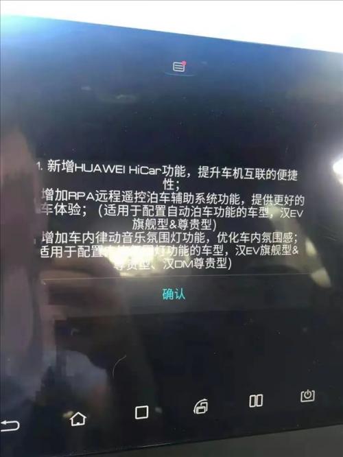 日前,有比亚迪(002594,股吧)汉车主收到OTA推送,新增了华为HiCar功能。