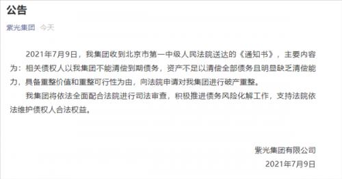 7月9日消息,今日,据紫光集团官方消息,2021年7月9日,我集团收到北京市第一中级人民法院送达的《通知书》。