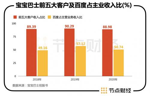 除了百度,连续三年来排名二、三的供应商分别为谷歌和腾讯。招股书显示,2018年-2020年,宝宝巴士来自前五大客户的收入占比分别为89.39%、90.29%、88.98%,约为九成,客户集中度过高,未来一旦有所变化,营收也将受到重大影响。