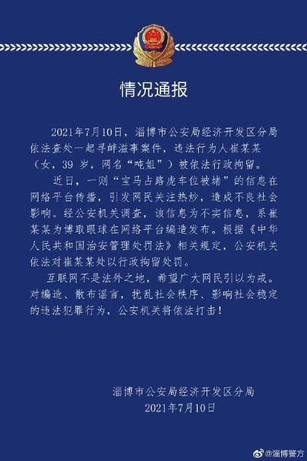 淄博市公安局微博通报,7月10日,淄博市公安局经济开发区分局依法查处一起寻衅滋事案件,违法行为人崔某某(网名“吨姐”)被依法行政拘留。