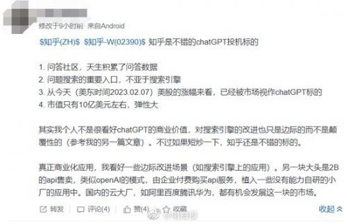 有消息称,知乎股价的此次爆发或许与当前爆火的“ChatGPT概念”有关。此前,中银国际发表研究报告指出,ChatGPT注册用户激增,AIGC潜力巨大,引起市场关注。该行表示,不会低估ChatGPT长远而言所带来的潜在颠覆性,但以目前的用户体验、应用场景、进入壁垒和商业化潜力来评估,未能证明其巨大投资成本是合理的。该行认为,预期拥有数据和资本优势的大型平台公司,将较AI软件企业更能受惠。