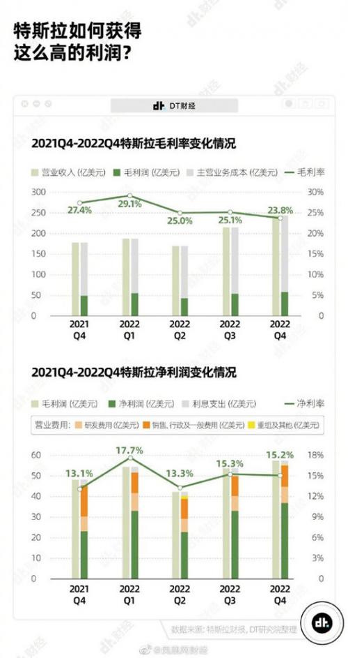 不过,特斯拉整体收入却在上升。这与特斯拉在第4季度大幅降价有一定关系――每卖出一辆车能赚到的利润更少了,但因为降价带来更高销量,整体还是赚到了更多钱。而比起其它车企,特斯拉一直以来都以高毛利率见长。