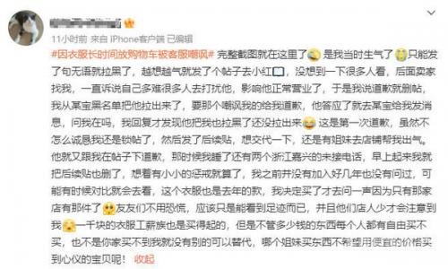 被客服嘲讽当事人发微博称,商家曾两次道歉。自己被嘲讽后,一时气不过就把事情的来龙去脉发在了某社交平台上。很多人看到后,商家主动联系了这个买家并道歉。不过在这个过程中,当事人发现商家也把她拉黑了。当事人表示,“这是第一次道歉,虽然不怎么诚恳我还是锁帖了,然后发了后续帖。不过还是有姐妹去店铺帮我出气,他就又跟我在帖子下道歉。手机也显示了两个未接电话。”