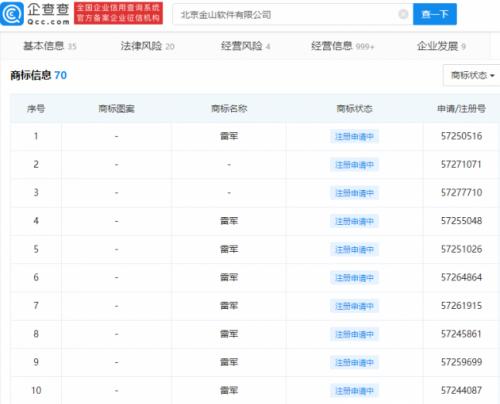 【TechWeb】企查查APP显示,近日,北京金山软件有限公司申请注册多个“雷军”商标,国际分类涉39类运输贮藏、40类材料加工等。