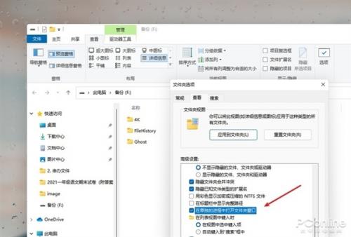 除此之外,选项里的“在单独的进程中打开文件夹窗口”也不再是之前的作用。勾选后将自动回退至Win10样式(右键菜单也会回退)。