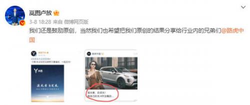 事情的起源还得从3月8日岚图汽车CEO卢放发布的一条微博说起。3月8日,@岚图卢放发微博调侃路虎文案抄袭。他艾特路虎官方微博称:“我们还是鼓励原创,当然我们也希望把我们原创的结果分享给行业内的兄弟们。”