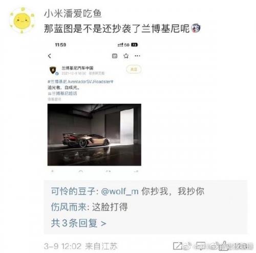 不过该微博发布后不久,有不少网友在卢放的微博下面评论,兰博基尼早在2021年12月9就用过这个文案:“追光者,自成光”,并表示“那岚图还抄了兰博基尼!”