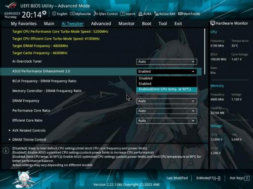 华硕B760小吹雪主板不仅颜值出众,战力更是十分强悍,其拥有12+1供电模组(60A),搭配8+4 Pin ProCool高强度供电接口,可轻松驾驭Intel酷睿13代处理器。两组超大VRM散热片能够显著降低供电区温度,以提供更好性能。支持APE 3.0(ASUS Performance Enhancement 3.0)功能,在BIOS中开启后即可一键解锁处理器功耗,提供更强的处理器性能释放。考虑到新酷睿处理器功耗设计,华硕还贴心地加入了温度墙为90℃的解锁模式(此模式下性能释放会高于默认设置,略低于完全解锁模式),玩家可以根据自己主机的散热条件和使用需求来酌情选择。