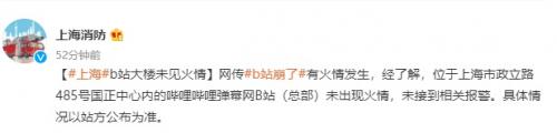 与此同时,网传B站崩了是因为有火情发生。对此,上海消防迅速辟谣:经了解,位于上海市政立路485号国正中心内的哔哩哔哩弹幕网B站(总部)未出现火情,未接到相关报警。具体情况以站方公布为准。