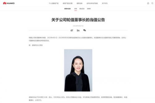 3月31日,华为官方发布了“关于公司轮值董事长的当值公告”。公告显示,根据公司轮值董事长制度,2023年4月1日~2023年9月30日期间由孟晚舟女士当值轮值董事长。轮值董事长在当值期间是公司最高领袖,主持公司董事会及董事会常务委员会。