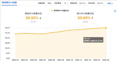 近日,据国家IPv6发展监测平台统计数据,截止2023年2月,国内移动网络IPv6占比终于突破50%大关,达到了50.08%。