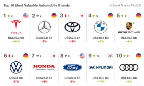 具体来看,排名前十的汽车品牌依次是:特斯拉、奔驰、丰田、宝马、保时捷、大众、本田、福特、现代、奥迪。其中,位列榜首的特斯拉的品牌价值在2023年飙升44%达到662亿美元,是首次不生产内燃机的品牌在全球汽车品牌中名列前茅。
