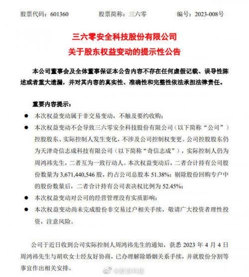 4月4日晚间,上市企业三六零发布了一则股权变动的提示性公告,无意见也公布了一条科技圈的重磅“八卦”:公司实际控制人周鸿t已经离婚了。