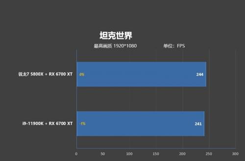 在游戏《坦克世界》中,锐龙7 5800X的得分为40421分,i9-11900K的得分为40004分,换算成帧数分别为244帧和241帧,锐龙7 5800X领先3帧。