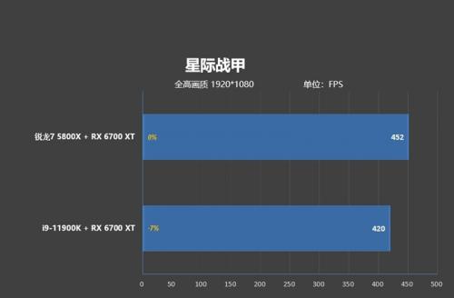 在《星际战甲》中,锐龙7 5800X的帧率为452帧,i9-11900K的帧率为420帧,相差帧数多达32帧,锐龙7 5800X领先幅度7%。