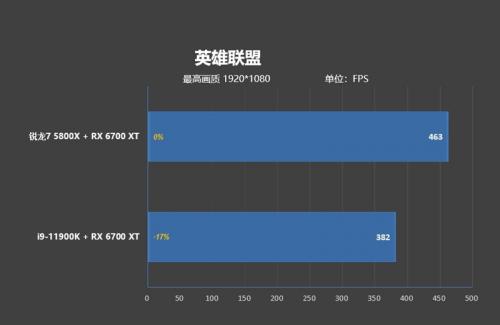 虽然《英雄联盟》不怎么依靠配置,但对帧率下限的要求却很高,上限高下限自然也就不会低了。这方面锐龙7 5800X的表现更为出色,在最高画质下帧率达到了463帧,i9-11900K的表现也不差有382帧之多,但是和锐龙7 5800X相比相差81帧,差距达到了17%。