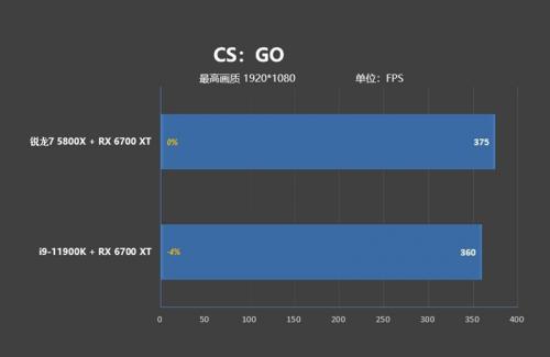 在《CS:GO》的自定义最高画质测试中,锐龙7 5800X的帧率为375帧,i9-11900K的帧率为360帧,两款处理器的帧率虽然都很夸张,但锐龙7 5800X的表现依然好过i9-11900K,整体多出15帧,领先幅度4%。
