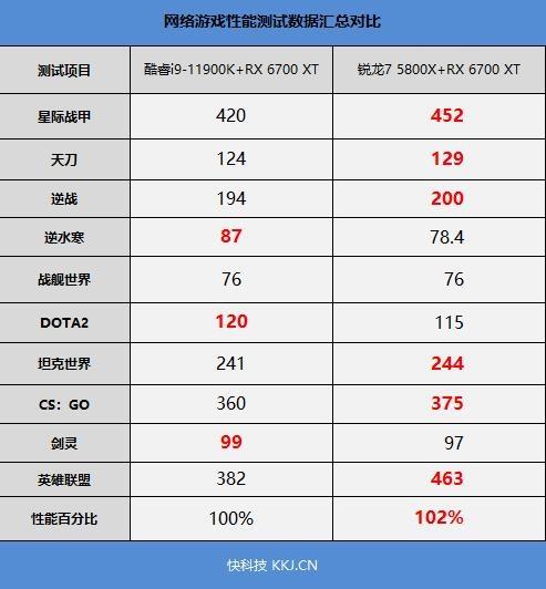 从以上10款网络游戏来看,锐龙7 5800X的表现要好过i9-11900K,领先幅度在2.5%左右。对于网络游戏来说,由于需要玩家同场景协作、进行多人副本,所以对处理器的要求要高过单机游戏,性能更强的处理器更适合网络游戏。