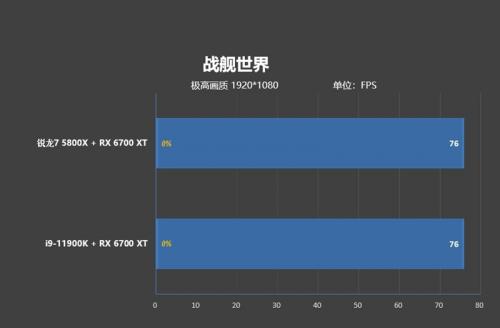 《战舰世界》是一款对操作要求较高的游戏,但让人奇怪的是在极高画质下帧率被锁定在75帧左右,虽会上下波动,但不管是锐龙7 5800X还是i9-11900K,波动范围不超过5帧。在与RX 6700 XT的配合下,帧数都达到了76帧,表现相当优秀。