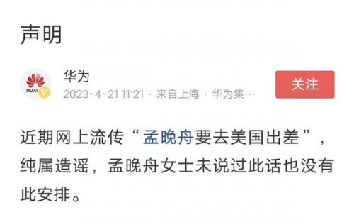 4月21日,华为集团发布声明称:“近期网上流传‘孟晚舟要去美国出差’,纯属造谣,孟晚舟未说过此话也没有此安排。”
