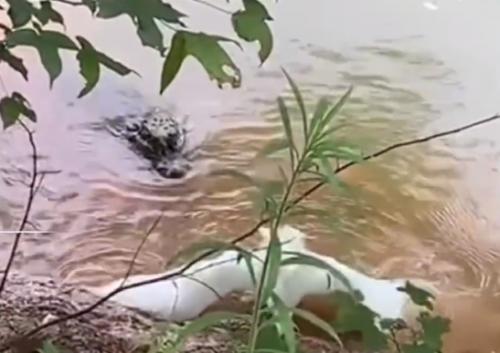 视频中,可以看到一只白鹭在河边挣扎上岸,被鳄鱼一口咬住拖入了水中。