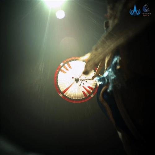 图中可见降落伞全貌和经气动烧蚀后的完整背罩结构,同时背罩上的姿控发动机导流孔清晰可辨。
