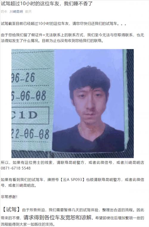 川崎昆明表示:试驾截至目前已经超过10小时的这位车友,请您尽快归还我们的试驾车。