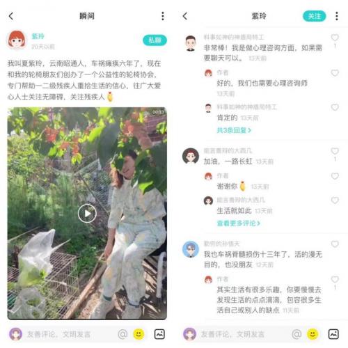 一位情况相仿的Souler因车祸导致脊髓损伤已经13年了,轮椅成了他最亲密的伙伴。当他表示“活得漫无目的,也没朋友”时,@紫玲鼓励他“其实生活有很多乐趣,你要慢慢去发现生活的点点滴滴,包容很多自己或他人的缺点。”