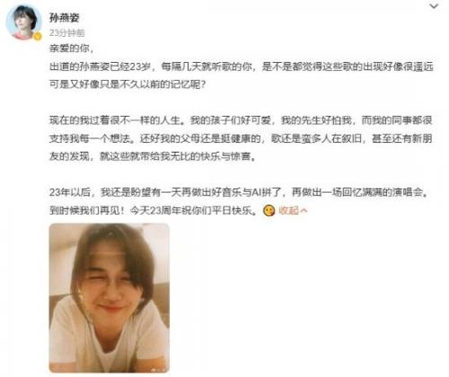 “23年以后,我还是盼望有一天再做出好音乐与AI拼了,再做出一场回忆满满的演唱会。到时候我们再见!今天23周年祝你们平日快乐。”