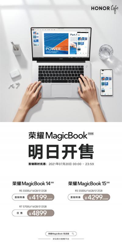经过多日预售后,两款新品将于7月20日零点正式开售,MagicBook14首销优惠价4199元起,MagicBook15首销优惠价4299元。