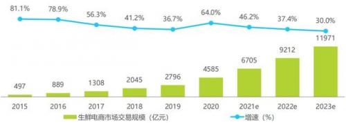 据艾瑞咨询数据显示,2020年中国生鲜电商行业规模达4585亿元,较2019年增长了64.0%。渗透率在不断加大。