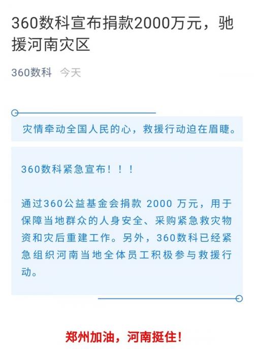 7月21日,360数科紧急宣布,通过360公益基金会捐款2000万元,用于保障当地群众的人身安全、采购紧急救灾物资和灾后重建工作。另外,360数科已经紧急组织河南当地全体员工积极参与救援行动。此外,360集团、周鸿t也宣布捐赠2000万紧急驰援河南郑州。