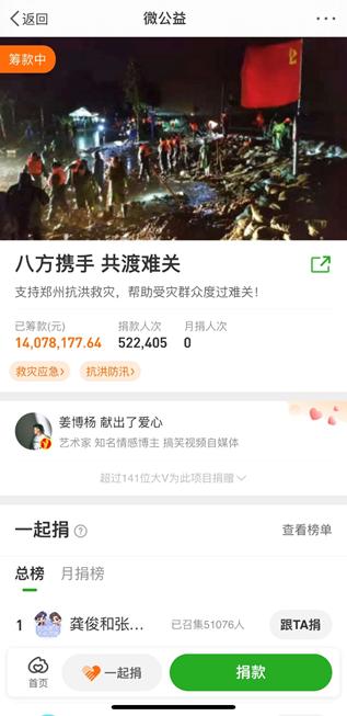 目前,18个救灾项目已完成筹款目标,其中郑州市红十字会“八方携手工渡难关”救灾项目捐款人次超过52万,捐款金额超过1400万元。