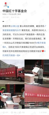 7月21日19点,@中国红十字基金会更新微博:感谢爱心网友捐赠,共获得29242人次的支持,可以为2000户家庭提供一周的应急生活保障!