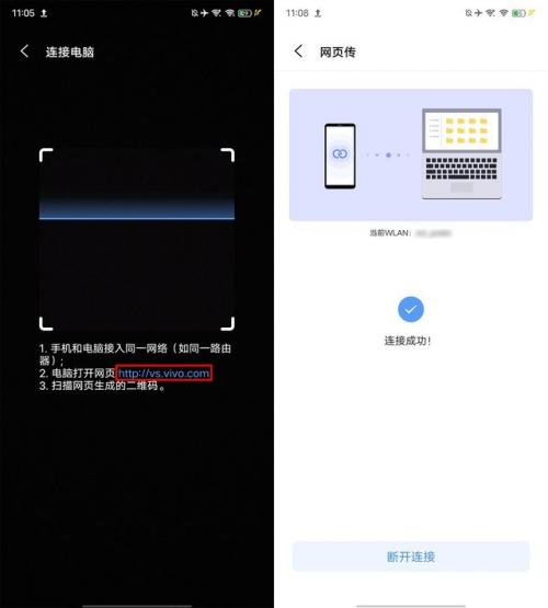 开启vivo互传后,点击“连接电脑”,我们就能看到扫码界面和一行网址: