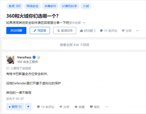 在知乎上,有人提问360和火绒你们选哪一个?认证为360安全工程师的VeroFess回答了问题,他的建议是两个都没选,有钱的就卡巴斯基全方位安全软件,没钱的就是微软自带的Defender里打开基于虚拟化的保护,其他的一概不推荐。