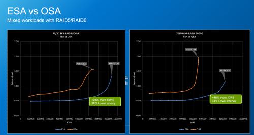 测试数据也显示,ESA架构与OSA架构相比,持续写入的吞吐量明显提高;ESA架构中RAID5/6不仅能提高性能,还能降低TCO拥有成本;使用25GbE时,ESA架构无法实现全面收益,企业可以使用100GbE提升网络性能;此外,ESA架构还提供几乎无损的数据压缩功能。