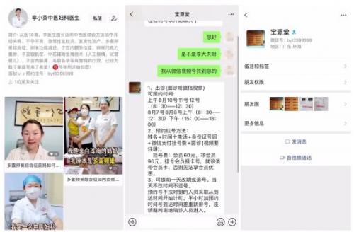 即便不认证,一些”医生号”依旧可以自由活跃在视频号平台。名为“李小英中医妇科医生”的微信视频号,发布了3个与病症相关的宣传视频,将个人联系方式放在介绍页,当用户通过介绍页添加微信好友后,被推荐到了一家线下小诊所。