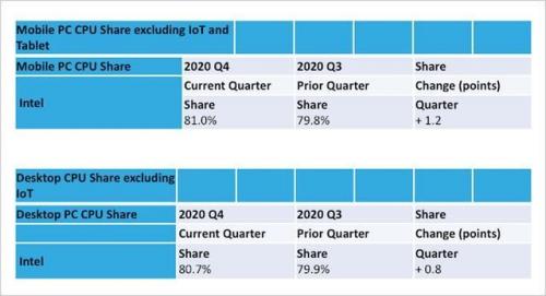 2020年Q4英特尔的全球CPU市场份额增长情况