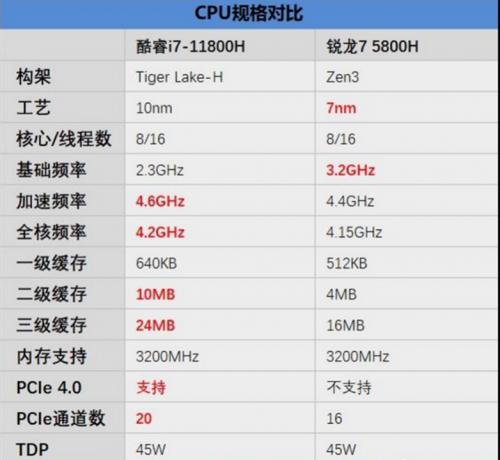 以酷睿最新的H45(第11代英特尔酷睿处理器高性能移动版)系列为例,其中的i7-11800H拥有8核16线程,工作频率为2.3-4.6GHz,三级缓存为24MB。和锐龙的R7-5800H对比,i7在游戏等实际使用场景下的性能更强。