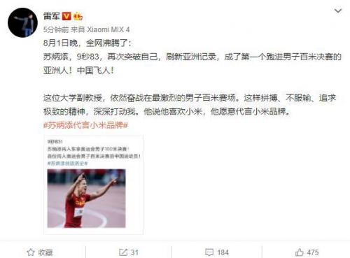 此前在东京奥运会上跑出9秒83成绩、刷新亚洲记录,也是第一个跑进男子百米决赛的亚洲人苏炳添将成为小米品牌代言人。