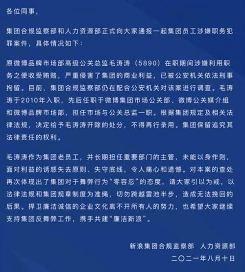 据媒体报道,新浪集团合规监察部人力资源部已经内部发布通报,称毛涛涛在职期间涉嫌利用职务之便收受贿赂,严重侵害了集团的商业利益,现已被公安机关依法刑事拘留。