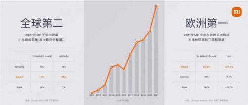 前几天,小米第三次上榜了《财富》世界500强,全球排名338名,进步了84名。还有一个好消息,大家可能都已知道:国际调研公司IDC报告显示,2021年第二季度,我们的手机销量超过苹果,首次成为了全球第二。全球市场占有率达到16.9%。也就是说,全球每卖出六部手机,就有一部小米。销量同比增长86.6%,小米正在高速成长中。