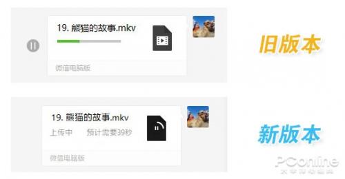 文件传输面板更换了新样式,除了进度条由横改圆以外,还增加了文件体积、状态显示(上传中/发送暂停)、预计完成时间三组比较实用的参数。