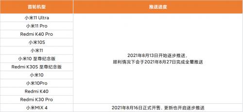 小米11 Ultra、小米11 Pro、Redmi K40 Pro、小米10S、小米11、小米10至尊纪念版、Redmi K30S至尊纪念版、小米10、小米10 Pro、Redmi K40、Redmi K30 Pro已于8月13日开始逐步推送,顺利情况下会于8月26日完成全量推送。