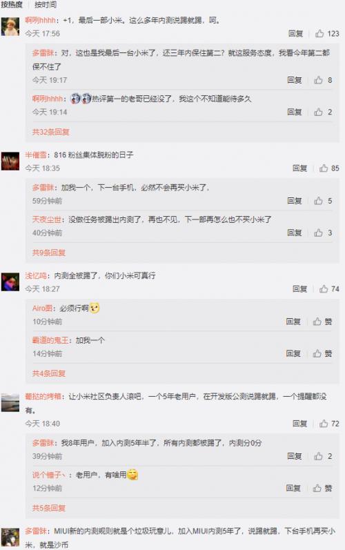 MIUI内测组这一举动惹怒了不少米粉,特别是一些资格很老的玩家,他们参与内测多年了,现在被踢很不爽,在雷军微博下集体刷屏,甚至表示今天816是米粉集体脱粉的日子。