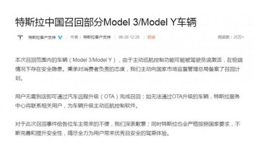特斯拉表示,“对于此次召回事件给各位车主带来的不便,我们深表歉意。”