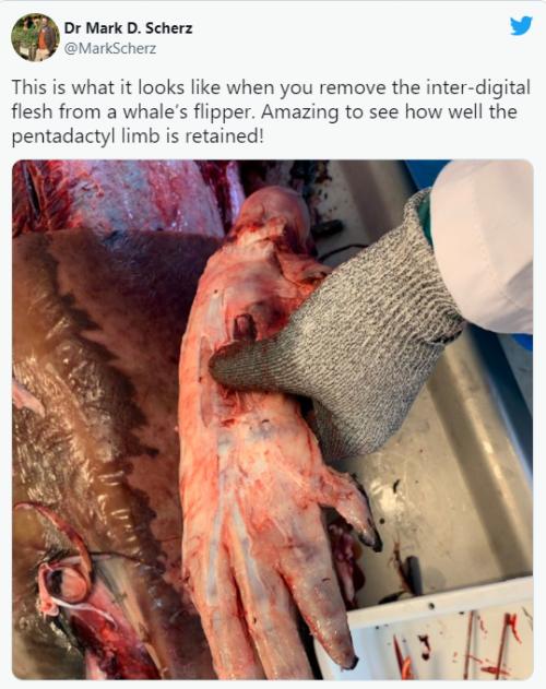谢尔兹博士表示,解剖的鲸类是索氏中喙鲸,这只鲸由于已经死亡才被解剖,用于研究和收集相关数据。五趾存在于多种动物中,这也许说明它们拥有一个共同的祖先。